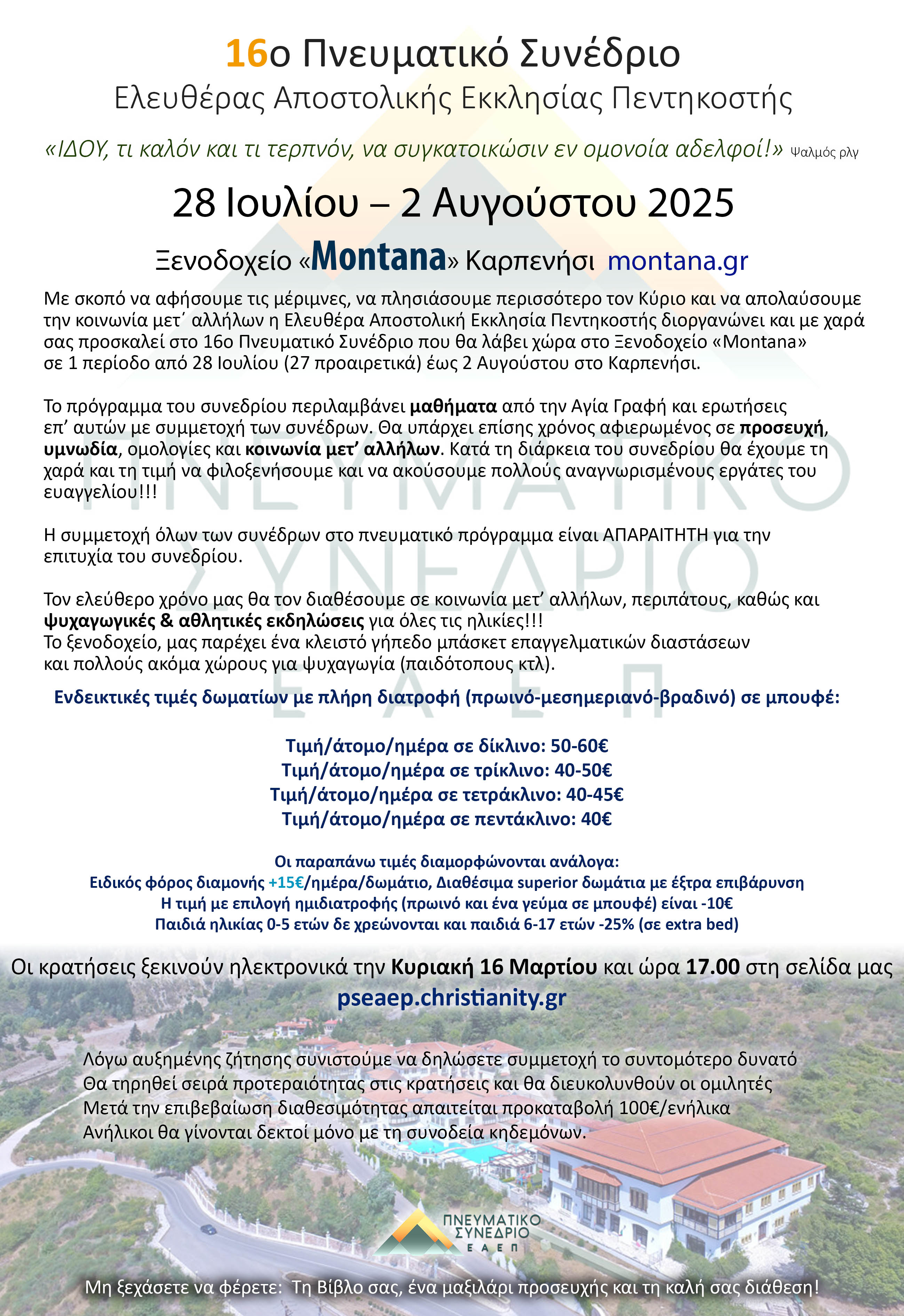 Αυτό άρεσε πρώτα στον Κύριο και μετά στους υπόλοιπους αδερφούς και έτσι ο αδ. Δημήτρης Κοτσώνης ανέλαβε να βρει έναν κατάλληλο χώρο να διοργανώσει την εκδήλωση αυτή. Αποφασίσαμε να αποφύγουμε τη θάλασσα και τη κοσμοσυρροή και να πάμε όλοι μαζί σε ένα ήσυχο μέρος κάποιου βουνού της πατρίδας μας. Και κάπως έτσι ξεκίνησε το Πρώτο Πνευματικό Συνέδριο...
